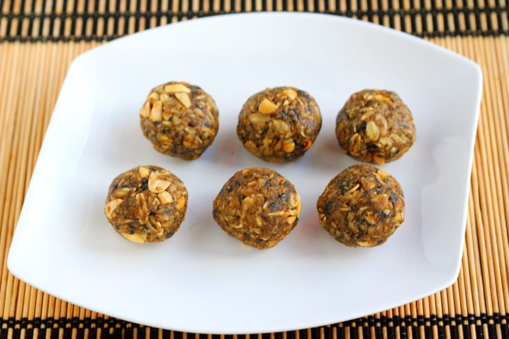 刻んだピーナッツを混ぜ、6等分にしラップで1つずつ包んでボール型にする。