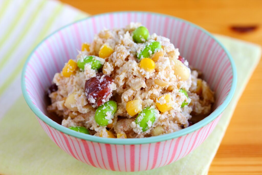 炊いたもっちりオートグローツがアクセントとなったおからサラダ。大豆でおからと相性の合う酸味の少ない豆乳ヨーグルトとツナでしっとり、おかずにもなるサラダです。