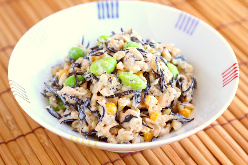 ①と炊いたオートグローツ(過去レシピ参照)、汁気を切ったツナ、ホールコーン、枝豆、マヨネーズを混ぜ合わせ、しょうゆで味を調える。