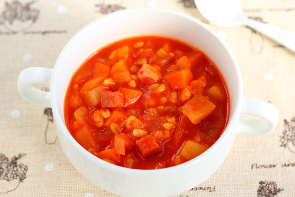 ホールトマト・オートグローツを加えてトマトを崩し、水を加えて蓋をし、弱火で15~20分野菜とオートグローツに火が通るまで煮込む。