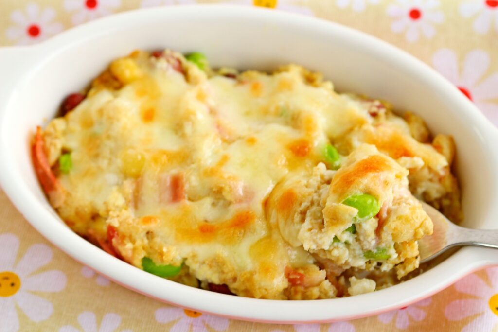 ①にコンソメ、ミックスビーンズ、ホールコーン、切ったベーコンを混ぜて塩コショウで味を調え、2等分して耐熱皿に盛り付ける。