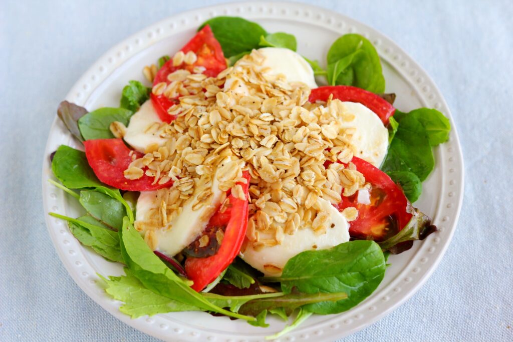 オートミールをカリカリに炒め、カプレーゼにトッピング。お好みのサラダでもOK!