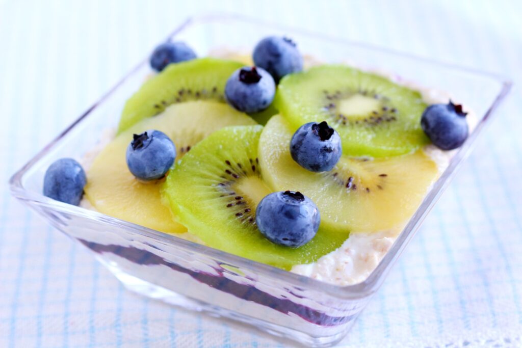 クイックオーツとヨーグルトを合わせると濃厚さっぱりなチーズの風味になることを生かし、フルーツと合わせてレアチーズケーキ風に仕上げました。