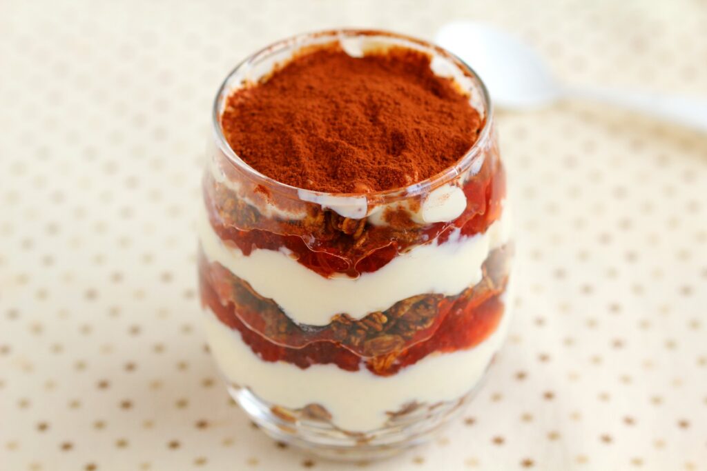 手作りチョコグラノーラのアレンジ。ヨーグルトとジャムで手軽にティラミス風にしました。
