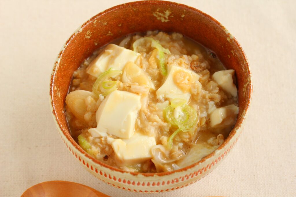 オートミールを塩麹でとろとろに煮て、ネギ・卵・豆腐でほっこりおじやにしました。肌寒い季節からおすすめのメニューです。
