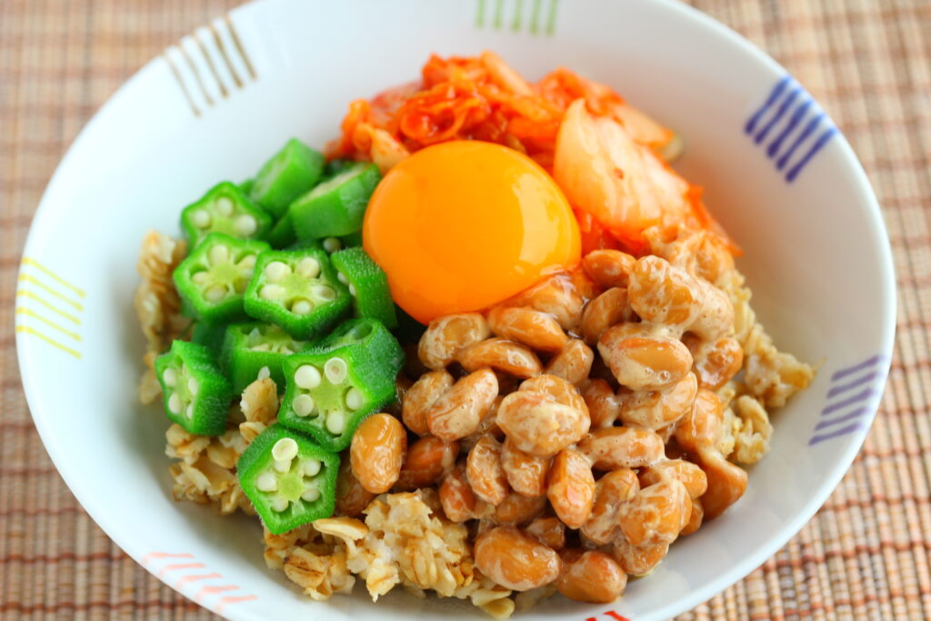 ②に小口切りにしたオクラ、納豆、キムチ、卵黄をのせ、しょうゆをかけ、混ぜていただく。
