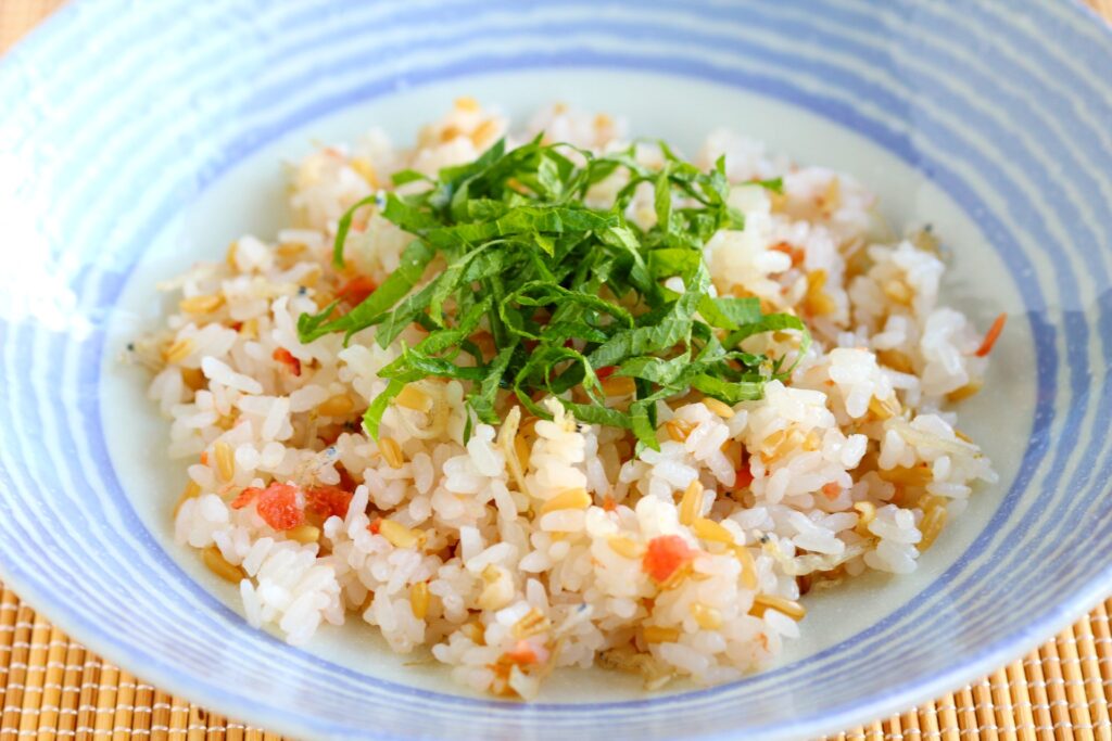 オートグローツ入りごはんを使い、梅・しらす・大葉でさっぱり和風に仕上げたチャーハンです。