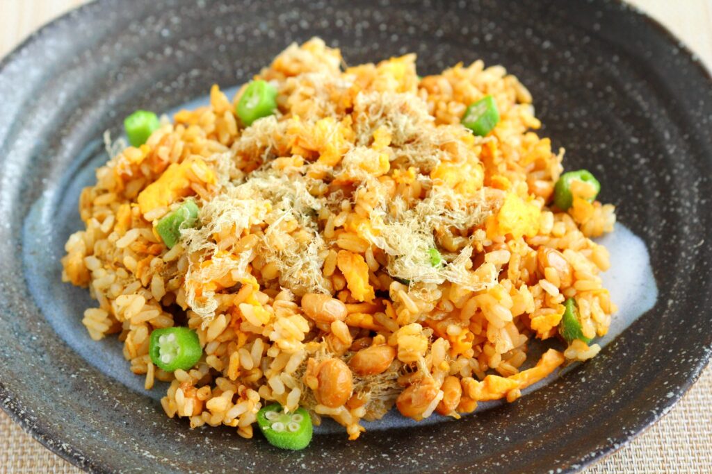 オートグローツ入りごはんを使った納豆チャーハン。とろろ昆布とオクラも入れて、とろネバ栄養アップです。