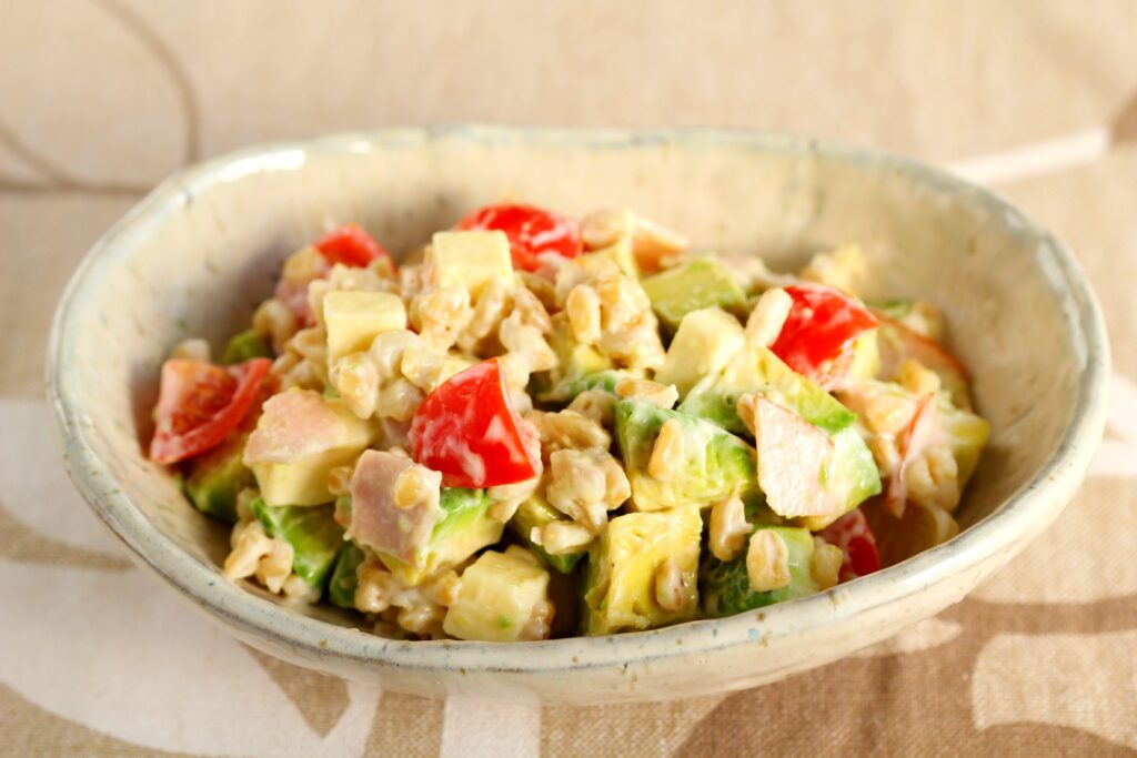 アボカドサラダにオートグローツをプラス。プチプチ食感も楽しめるサラダです。