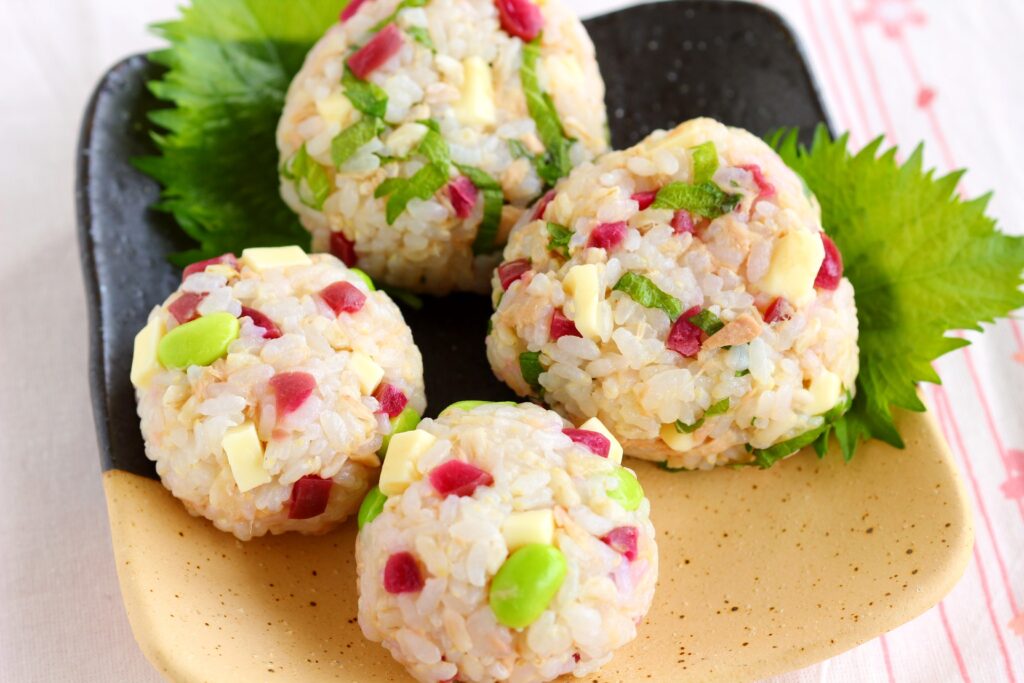 炊いたオーツライス入りごはんに、汁気を切ったツナ、細かく切ったチーズとカリカリ梅、白だしを混ぜる。