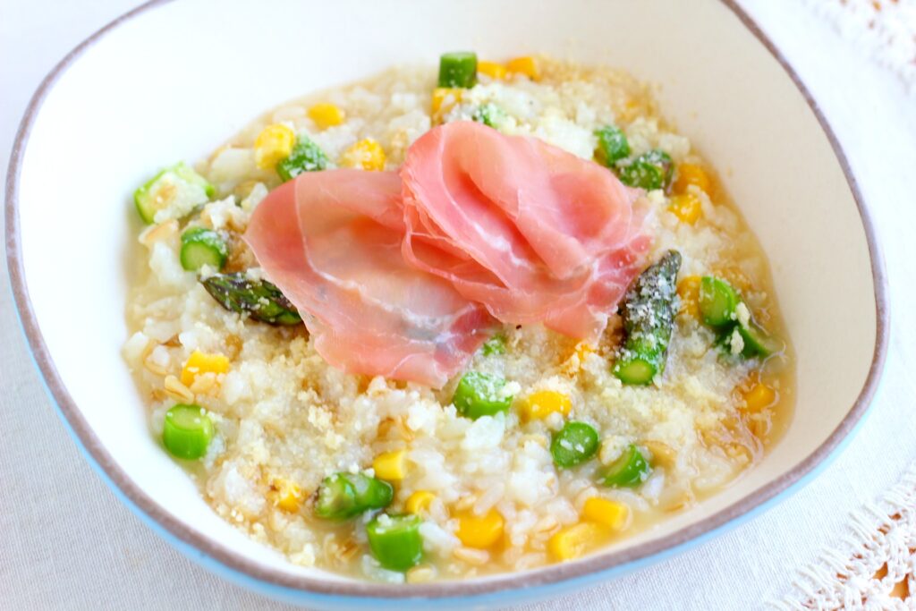 オートグローツ入りで炊いたごはんをリゾット風にしました。アスパラの食感とコーンの甘味、粉チーズでコクを出し、生ハムの塩気がアクセントとなっています。