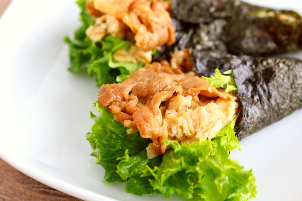 焼きのり、レタス、オートミール、焼肉の順にのせ、手巻きにする。