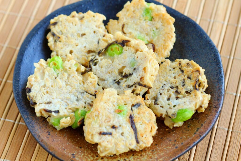 おつまみやおやつ、お弁当にも!枝豆と豆腐でタンパク質強化!塩昆布だけの味付けで手軽に作れるお焼きです。